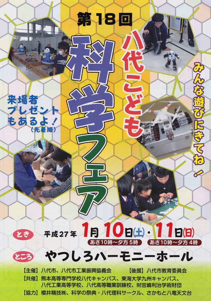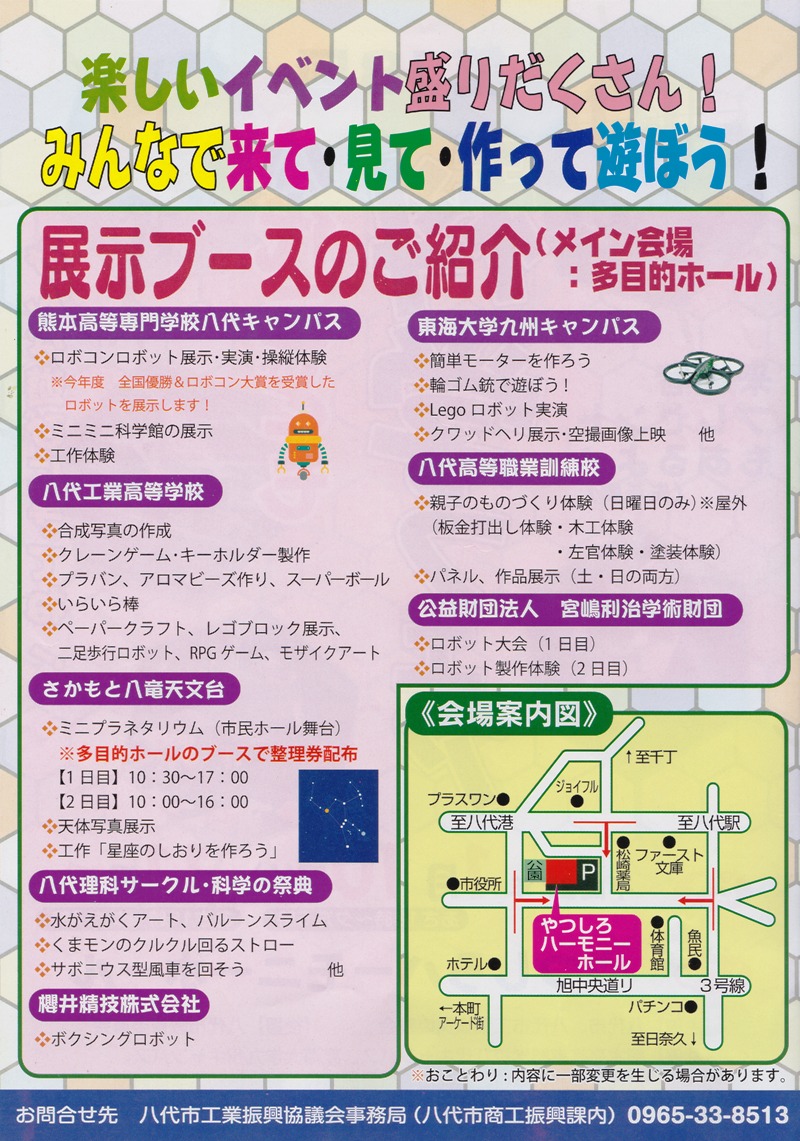 遊びを通して科学に興味を持ってほしいとの願いを込め八代市、八代市工業振興協議会が主催し開催されている「こども科学フェア」に今年も共催団体として参加いたします。毎年八代工業高校のブースは子供たちに大人気です!ぜひご来場ください。