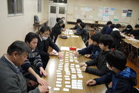 生徒と教職員が参加し、熱戦を繰り広げました。ルールは、1チーム3人に分かれて、取った札が多い方が勝ちになります。