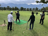 当日は、天候にも恵まれ、最初に到着したのは「一心行公園パークゴルフ場」。「パークゴルフ」は、ミニゴルフの一種で、1983年、公園で幅広い年代の人ができるスポーツとして考案されたもので、ルールは、ほぼゴルフと同じです。生徒職員共に初体験の人が多かったにもかかわらず、やっているうちに慣れてきて、カップインがある度に歓声が上がり、パークゴルフの面白さを堪能することができました。