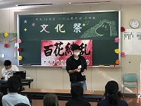 まず、開会式で、シンボル発表、日程の説明があった後、末廣校長から「文化祭は生徒一人ひとりが主役となる学校行事であり、展示、催し物、販売を通してお互いの良さや頑張りを知るよい機会である。今日は主役である自分たちが楽しみ、文化芸術に親しんでほしい」という挨拶がありました。