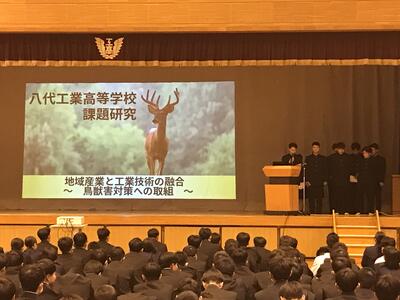 科目「課題研究」では、各科における工業の専門科目の学びをとおして身に付けてきた専門的な知識・技術を活用し、工業に関する課題を発見し、独創的に解決策を探求し、科学的な根拠に基づき創造的に解決することを目的にしている。各科の実践内容を1、2年生が知ることにより、学習意欲を喚起するとともに工業の学びを横断的に捉える力を養う。