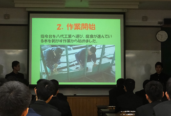 機械科は2クラスあるため、機械科3年A組は2年A組の生徒へ。機械科3年B組の生徒は2年B組の生徒へ1年間の課題研究の成果を発表しました。