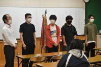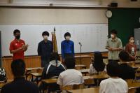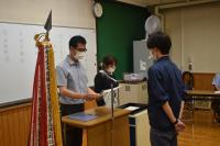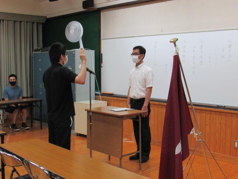 6月4日(金)の3限目に定通総体の選手推戴式が行われました!大会に参加する卓球部(5名)、バドミントン部(14名)、ソフトテニス部(5名)の選手紹介があり、その後、ソフトテニス部主将の宮尾君が選手宣誓を行いました。最後に村木校長先生が「相手をリスペクトして、最後まで正々堂々と全力でプレーしてください。」と激励の言葉を送られました。