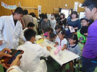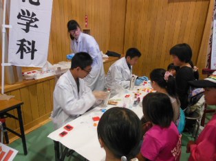 工業化学科は化学を利用したものづくりで子供達に大人気。たくさんの子供達が順番待ちをしてました。