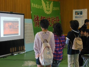 情報技術科では動画作品の上映やゲームコーナーがありました。2足歩行ロボットはトラブルにてテーブルで展示。