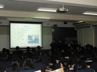 1月21日(木)2限目・3限目に視聴覚室にて3年生の課題研究発表会が行われました。校長先生、教頭先生に見学をして頂きました。司会は、団長の吉田向志くんが務めました。