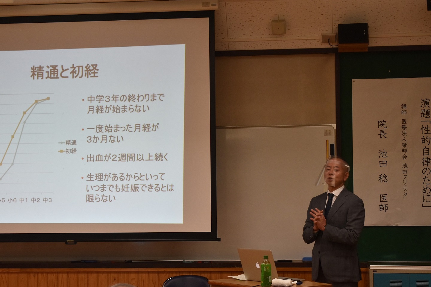 9月24日(木)医療法人榮邦会池田クリニックの池田稔医師を講師に招き性教育講演会を行いました。講演では、「大人の身体の基準」「身体の仕組と手入れの方法」「性の男女平等とは」「性」=命のつなぎ方 以上4つのテーマに沿って説明がありました。医者としての専門的な見地から、男女に係る性等について、力強く説得力のあるお話を聞きくことが出来ました。本日は遠方から、遅い時間までの講演ありがとうございました。