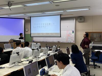 生成AIの技術説明をしてもらい実際に生成AIを使って「ワクワクする仕事とはなにか」を課題にし、スライド作成をして発表をしました。プロンプトにどの様な質問をすればいいかなど大学生3人の方々にアドバイスをしていただきながら作業を行いました。