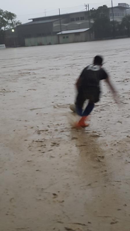 まずは敵が蹴ったボールをスライディングで捕って素早く反撃する練習(セービング)これは雨の日の方が地面が柔らかく、晴れの日のグラウンドコンディションよりもやりやすい。