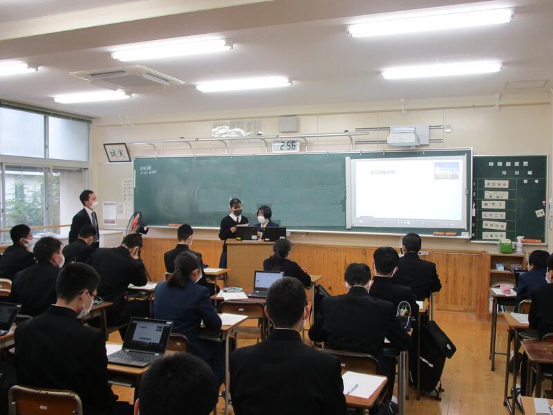 会自体は工業化学科2年の教室、オンラインで工業化学科1年生、企業実習でお世話になった3つの事業所(富士フィルム九州、オジックテクノロジーズ、野田市電子)の担当の皆様を交えての報告会となりました。