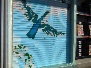 課題研究のグラフィックデザイン班で旭中央通り交差点近くのシャッターアートに取り組んでいます。デザインは環境をテーマに八代市の鳥であるカワセミを取り入れて谷口さんが作成しました。