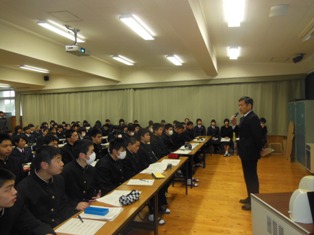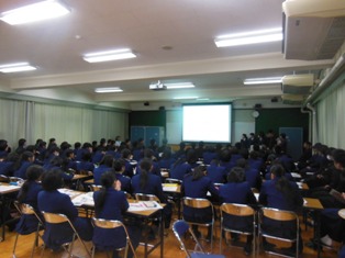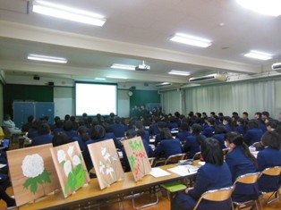 1月21日(木)2限目・3限目に視聴覚室にて3年生の課題研究発表会が行われました。校長先生、教頭先生に見学をして頂きました。司会は、団長の吉田向志くんが務めました。