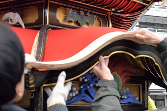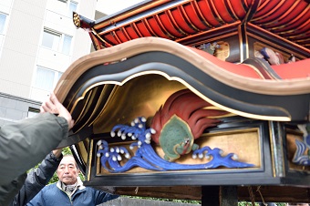 3年生の課題研究木工班では、笠鉾「蘇鉄」さんの部材再現に取り組んでいるのですが、この日、現物合わせ(?)で組み立て現場に伺いました。手作である鉾は、同じ部材でも一つひとつが微妙に違っており、部材が入れ替わると組み立てられないこともあるのです。