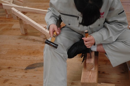技能検定の前期試験で、インテリア科3年生の女子3名が建築大工の3級を受験します。写真は放課後の練習の様子ですが、ノミやノコをほぼ持ったことがない初心者ですので、今は基本練習の繰り返しです。