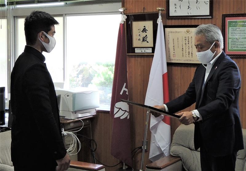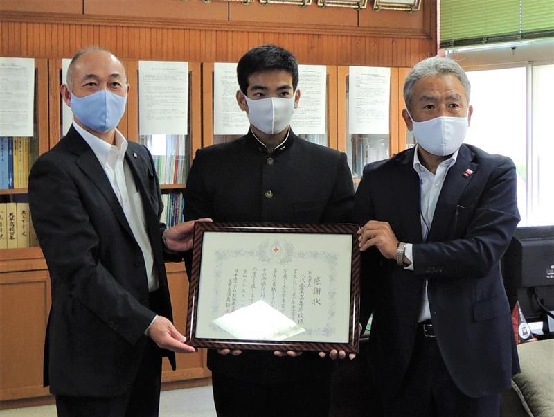 本校で生徒会を中心に地域のボランティアや募金、献血に取り組んできた活動に対する感謝状です。全校生徒を代表して生徒会長の田中義樹くんが受け取りました。