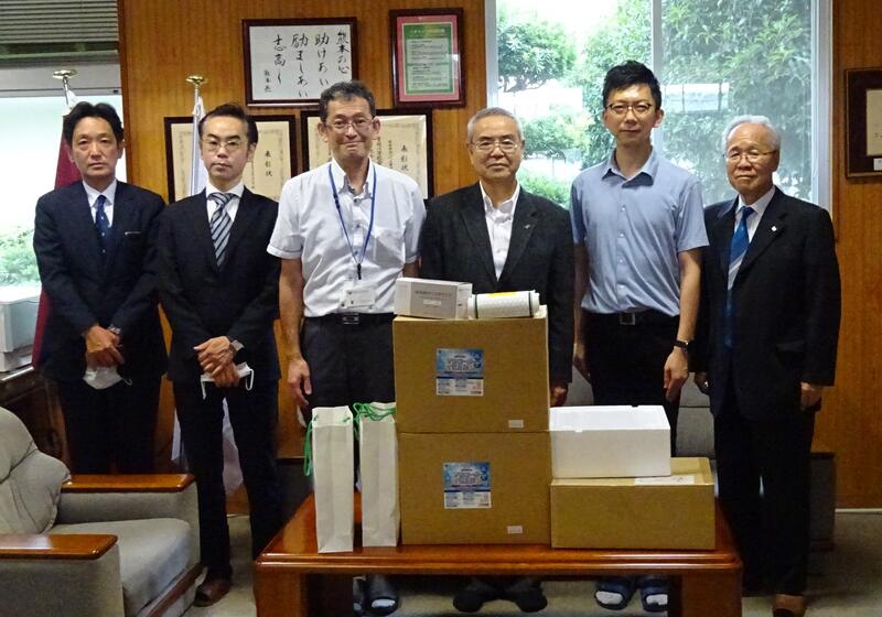 7月16日(金)九州リハビリテーション学院から、志垣理事長、田爪副理事長、志垣専務理事、島田事務次長が御来校され、マスク、消毒液等の寄付を頂きました。