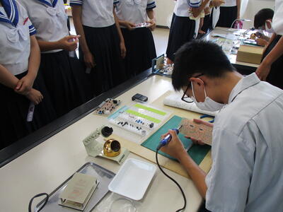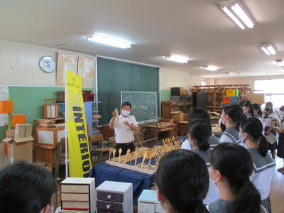 実習場の見学(木製スプーンと陶芸) ビデオ (DVD)の視聴(実習等の授業風景) 3年生からの説明 作品展示