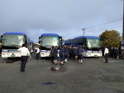 密を避けるためにバスは1台あたり20人。合計10台で移動します!