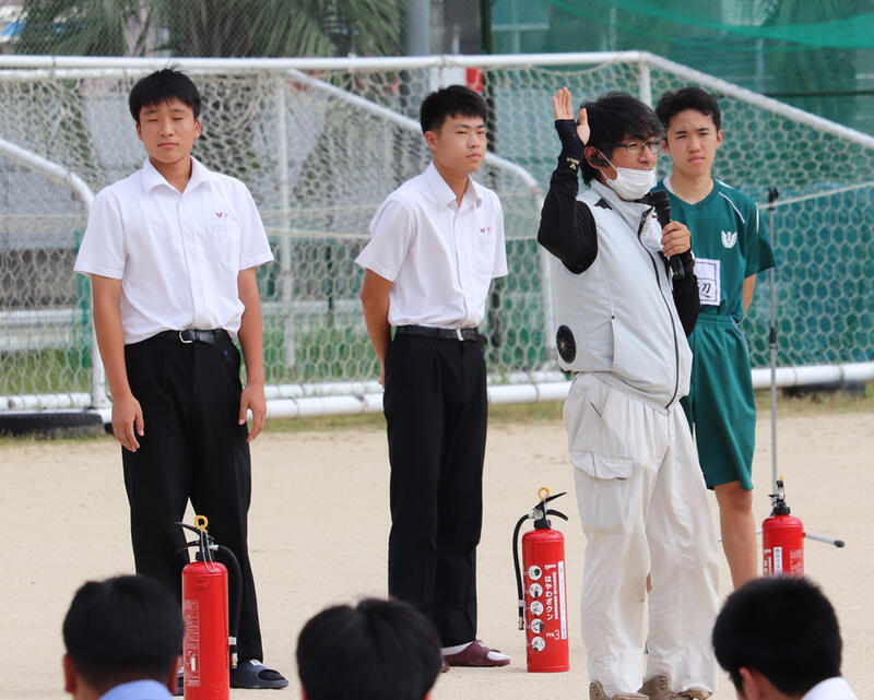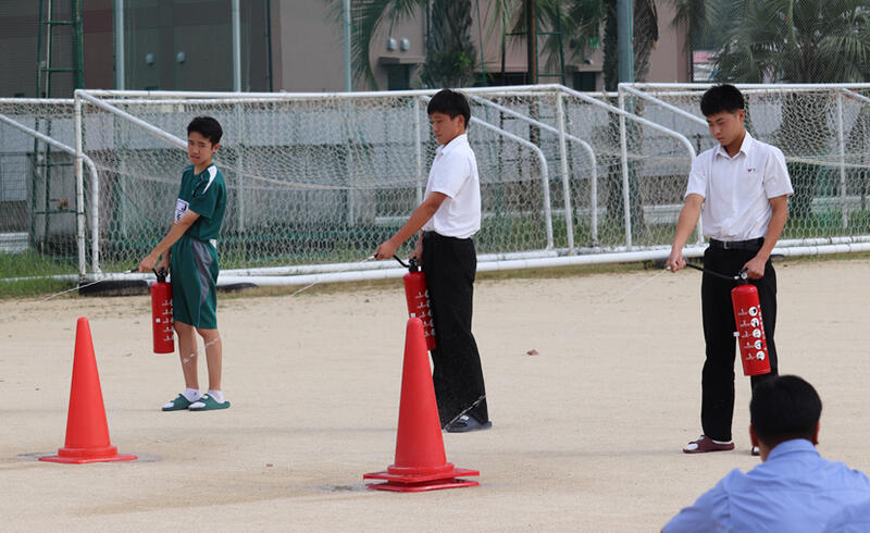 地震からの火災発生という設定で、シェイクアウト訓練とグラウンドへの避難訓練が行われました。消防署からも来ていただき、訓練を見ていただきました。また、消火設備の取り扱いについても教えていただきました。「訓練は本番のように、本番は訓練のように」いつ起こるかわからない災害に向けて、確認できた避難訓練となりました。