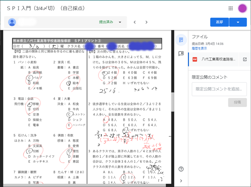 後半は、「一般常識」から「SPI」へ筆記試験を切り換える企業が増加するなか、「言語」「非言語」の問題傾向を知り、解くための基礎力を備えることを目的に、SPI入門に取り組んでいます。配付された電子データ(PDF)にタブレット端末を通じて直接書き込み、自己採点して提出します。(下図はその一部の様子)