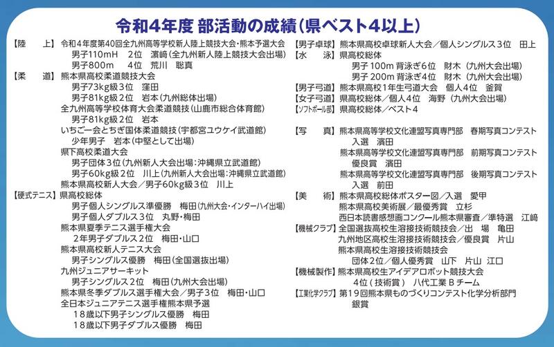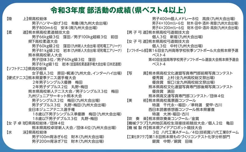 全国優勝選手も輩出した県南の雄「柔道部」、コンスタントに全国大会や九州大会へ出場している「陸上部」「水泳部」「空手道部」、古豪「野球部」・「サッカー部」、全国大会準優勝という快挙を成し遂げた「弓道部」、男女同時に九州大会出場を果たした「卓球部」、個人戦全国大会や団体戦九州大会出場のある「テニス部」、全国選抜ベスト16の「ソフトボール部」平成25年度に九州大会出場を果たした「バレー部」など多くの部活が県の高いレベルにいます。その他の部も県大会上位に入る力を持っています。