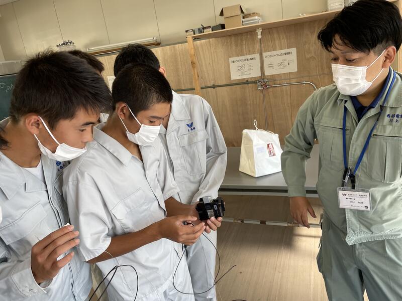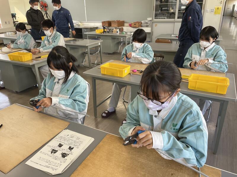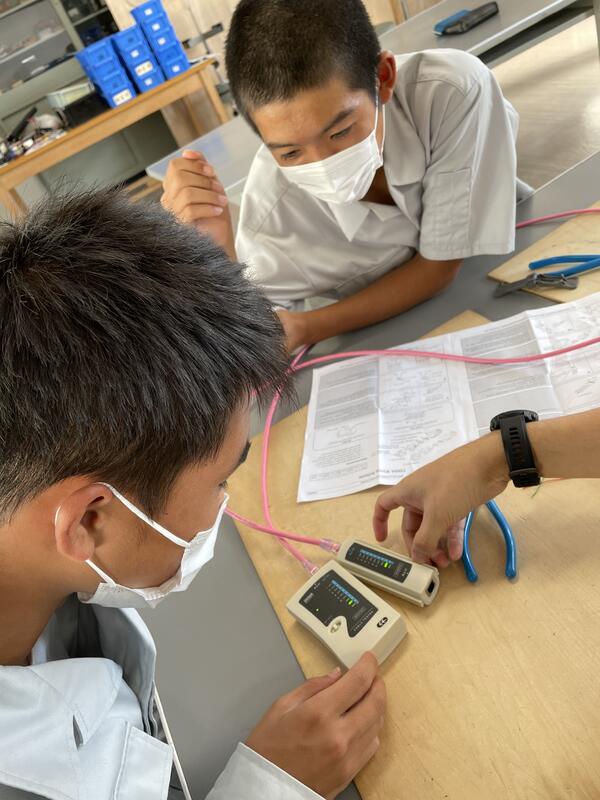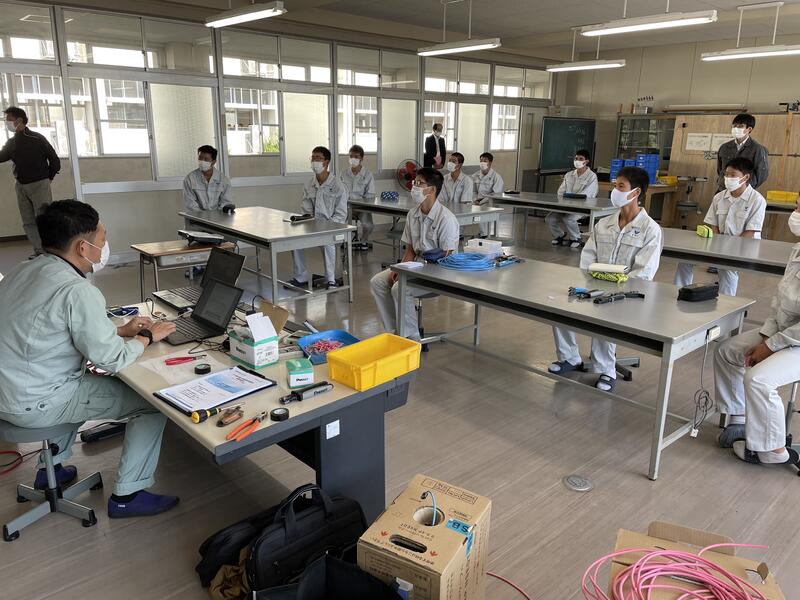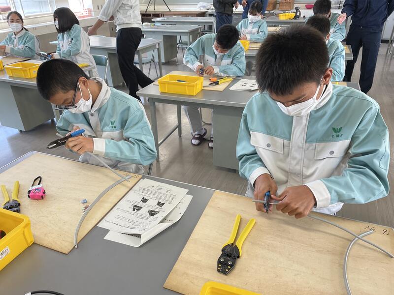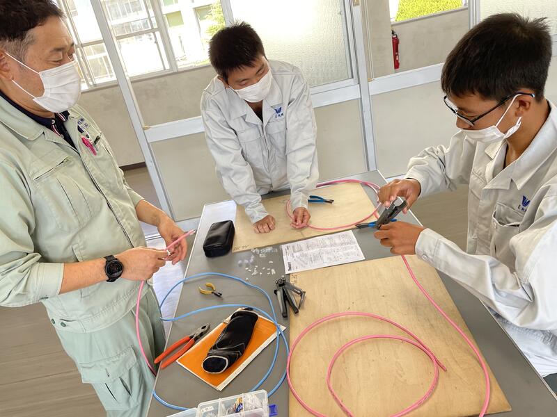 最初の1時間では緊張した面持ちでしたが、次第に笑顔やコミュニケーションがとれ良い緊張状態で作業を迎えました。残り2時間はケーブルの剥き方や終端接続のやり方について行い、最初は工具の使い方で苦戦していましたが、終了間際には一人で上手にできるまでになっていました。