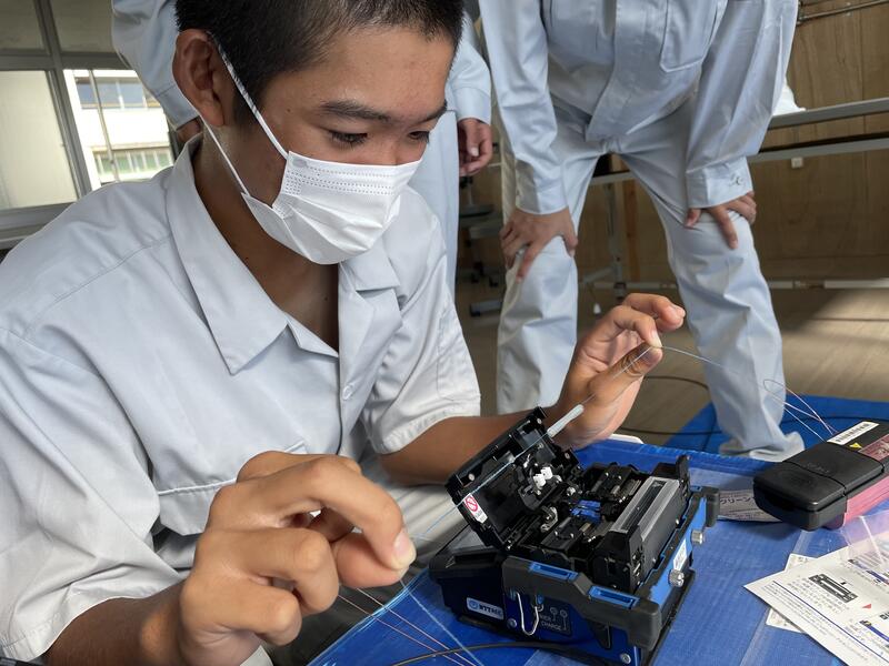 今回は「LANケーブルの制作と光ファイバの融着接続」について学びました。それぞれのことについて説明を聞き、実際に作業に移りましたが、LANケーブルでは扱ったことがなかったカテゴリー6の線を真っすぐにしたり、手先の器用さが必要な部分で苦戦していました。