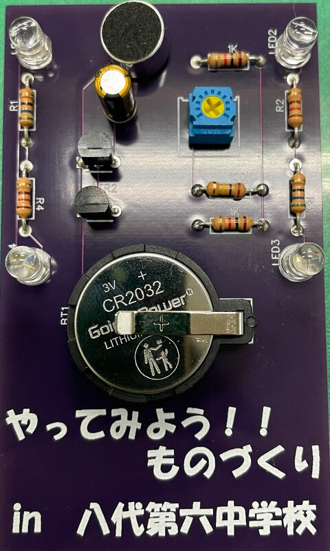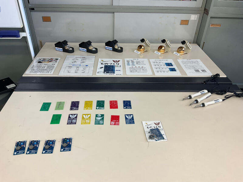 高校生活で培った専門技術を活用するため、電子工作を題材にした出前授業を計画し、準備を進めてきました。今回は「ボイス・ブリンガー」を設計し、中学生が製作しやすいように基板の改良を重ねてきました。