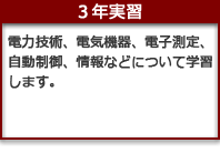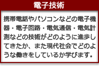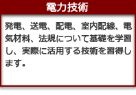 私たちの生活に深くかかわりを持っている電気について、その発生などの理論から送電・配電などの電気に関する分野、さらには最新のエレクトロニクス、コンピュータ、通信技術などの基礎について学習します。