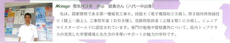 『電気科の生徒の皆様に、電気工事士の試験合格の一助となり、少しでもお役にたてばと、電線資材を寄贈させていただきます。日頃の学習にお役立ていただければ幸いです。一人でも多くの電気工事士が誕生する事を期待いたします。将来の熊本、いや日本の経済をおも担う八代工業の生徒さんに、併せてエールを送ります。』