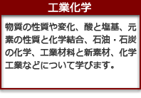 プラスチックや薬品など、私たちの身の回りにある化学製品について、どのような化学変化でどのような装置を使ってつくればよいかを、分かりやすく基礎から学びます。また、実習を通して基本的な分析(定量分析・定性分析)、コンピュータや機器を使った分析も学習します。