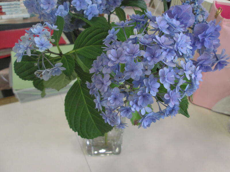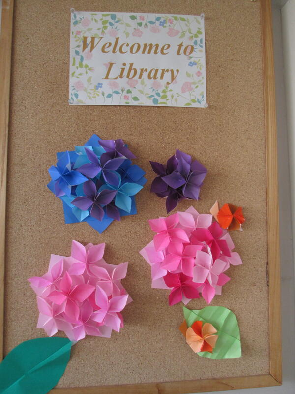 入り口には図書委員さんが折り紙で作った「立体あじさい」が飾られています。