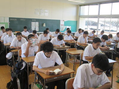・8時30分に準備のための放送があります。音楽が流れ始めたら机の上のものを片付けて、読書を始めてください。