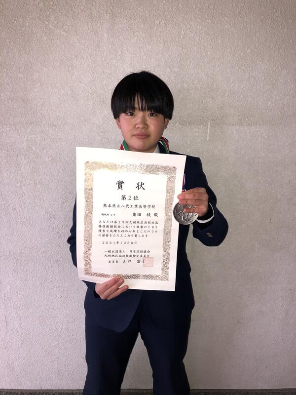機械科2年の亀田さん(坂本中出身)が令和3年度の溶接大会の県大会を経て、九州大会に出場しました。