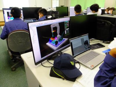 今日は、産業用ロボットの構造原理、プログラムの作成方法を理解し、3次元シュミレーションソフトによる動作確認、作業順序調整等の制御技術を学びました。