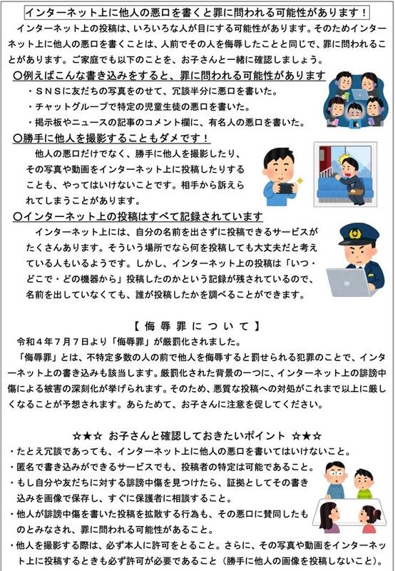 PDF資料⑦ → 情報モラル啓発資料⑦(家庭啓発用)~悪ふざけの投稿が取り返しのつかない事態に~.pdf