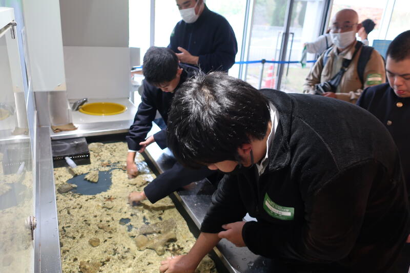 恐竜の化石や海や川に生息する生き物コーナーでは、興味津々に見学していました。