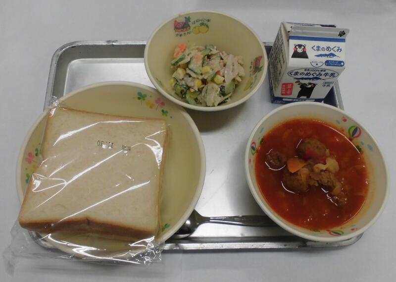 今日の献立は、食パン、ミートボールのトマト煮、れんこんサラダ、りんごジャム、牛乳です。