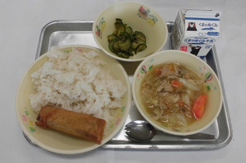 今日の献立は、セルフ中華丼、春巻き、きゅうりのピリ辛、牛乳です。
