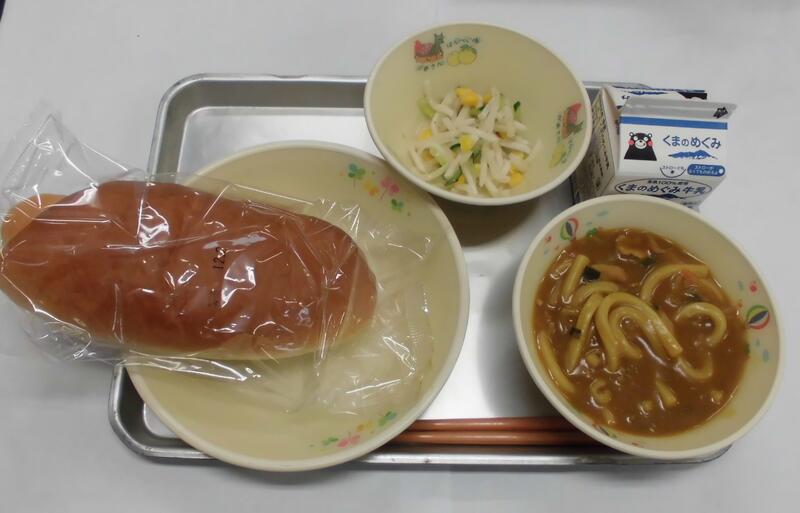 今日の献立は、ミルクパン、カレーうどん、大根サラダ、牛乳です。