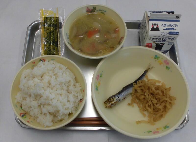 今日の献立は、麦ごはん、豚汁、たくあんのごま炒め、めざし、一食焼きのり、牛乳です。