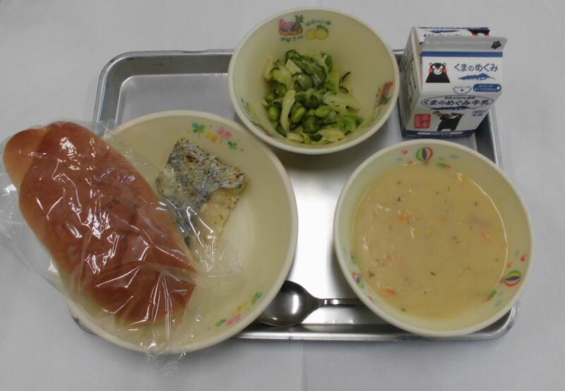 今日の献立は、ミルクパン、コーンスープ、魚のマーマレード焼き、グリーンサラダ、牛乳です。