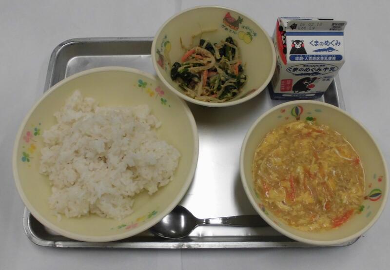 今日の献立は、麦ごはん、米粉のだご汁、うまかコロッケ、ちくワンサラダ、牛乳です。