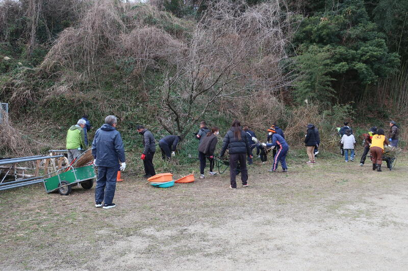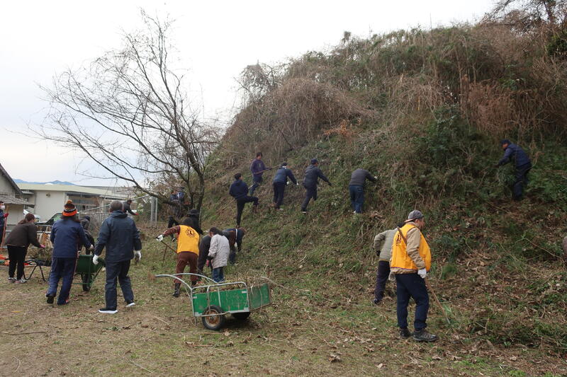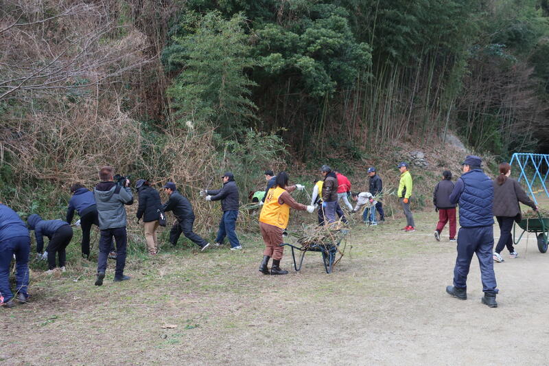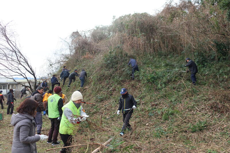 運動場入り口付近の丘を中心に樹木の伐採、斜面の草刈りなどが行われました。運動場は高島山に囲まれているため、手入れが困難な場所があり近年は草木が生い茂っていました。