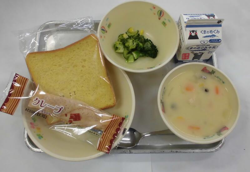 今日の献立は、かぼちゃパン、クリームシチュー、ブロッコリーサラダ、デザート、牛乳です。