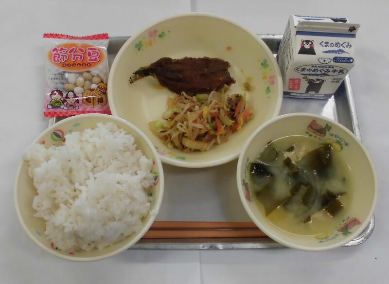 今日の給食は、麦ごはん、いわしのかば焼き、おかかあえ、みそ汁、節分豆、牛乳です。