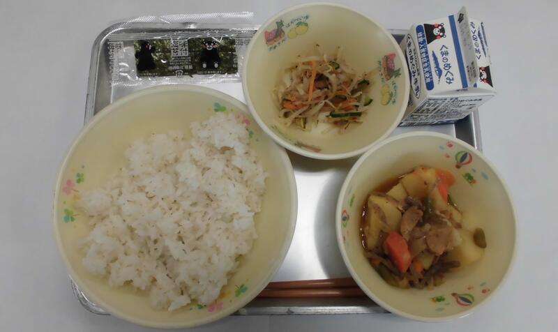 今日の給食は、麦ごはん、豚じゃが、おかかあえ、一食のり佃煮、牛乳です。