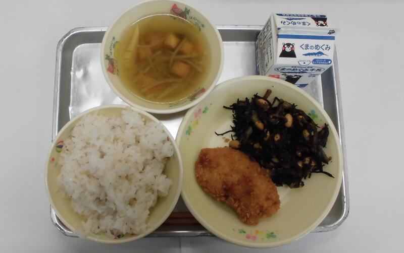 今日の献立は、麦ごはん、沢煮椀、白身魚のフライ、ひじきのいり煮、牛乳です。