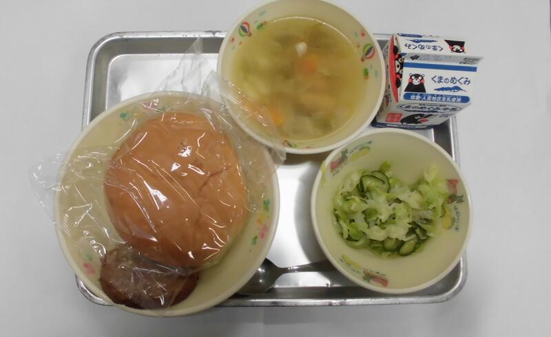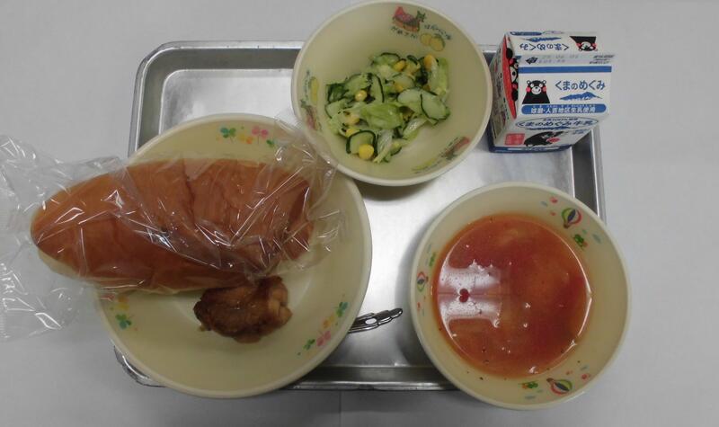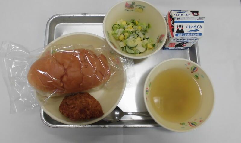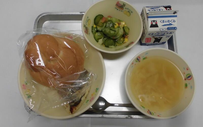 今日の献立は、ひのくにパン、魚のマスタード焼き、イタリアンサラダ、ポテトスープ、牛乳です。