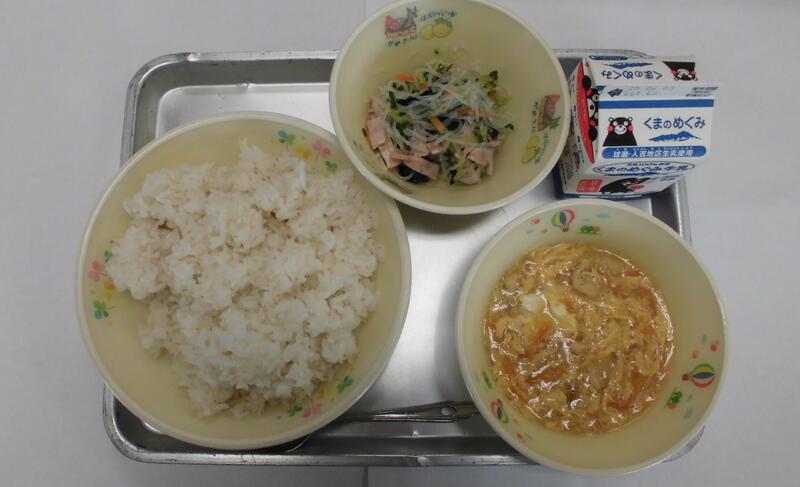 今日の給食は、セルフ親子丼、春雨の酢の物、牛乳です。